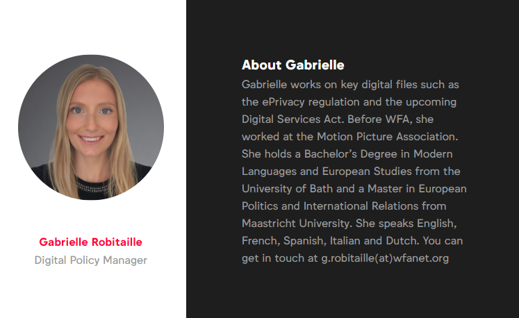 In this session, Gabrielle provided the Toolkit group with a summary of latest developments, expected next steps and WFA action on all relevant EU digital policy files likely to have far-reaching impacts on the digital advertising market. This included: